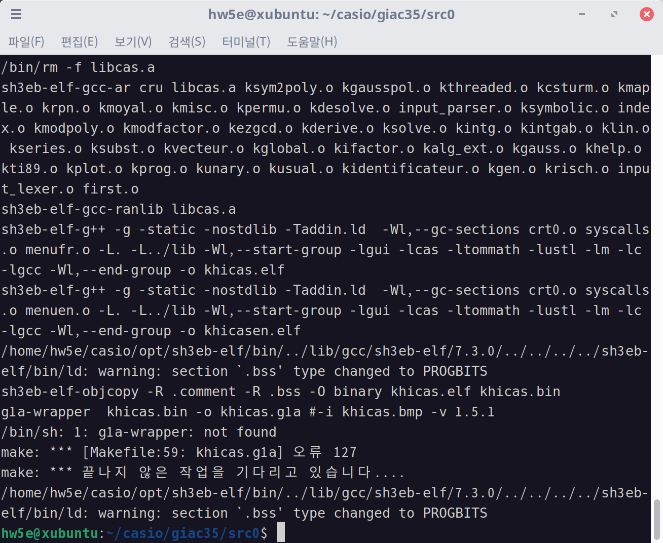g1a-wrapper를 설치하고 다시 빌드를 시도하니 이번엔 권한이 없다고 뜨는데 빌드한 결과물을/shared/tmp에다 복사하려고 해서 그런 것이였다. 빌드 자체는 성공해서 빌드된 파일은 소스코드들 사이에 잘 있었다. 그냥 Makefile에서 결과물을 복사하는 부분을 지웠다.