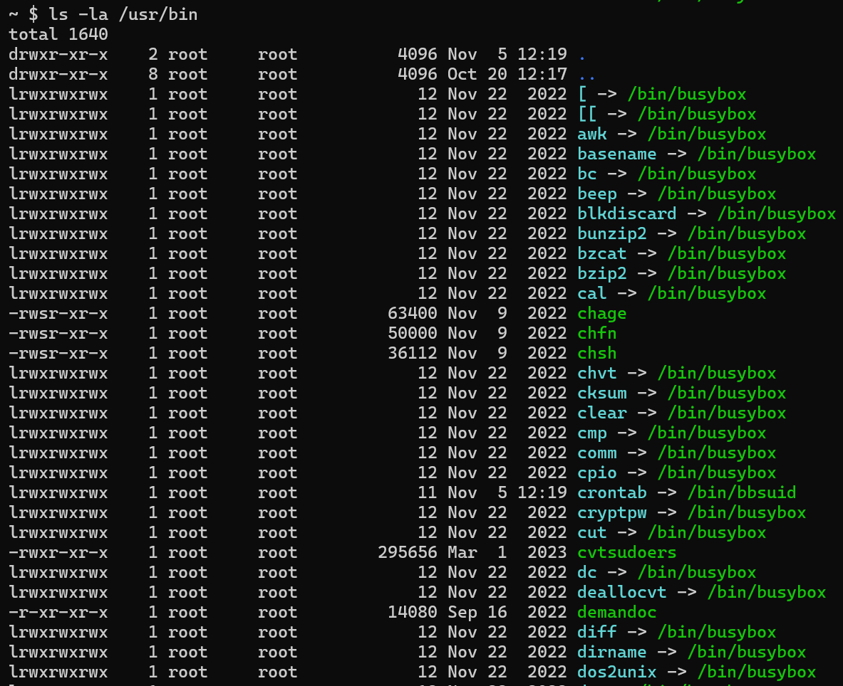 실제로 busybox를 사용하는 리눅스 배포판에서 /bin, /usr/bin에 있는 파일의 상당수가 busybox에 심볼릭 링크가 걸린 것을 볼 수 있다.
